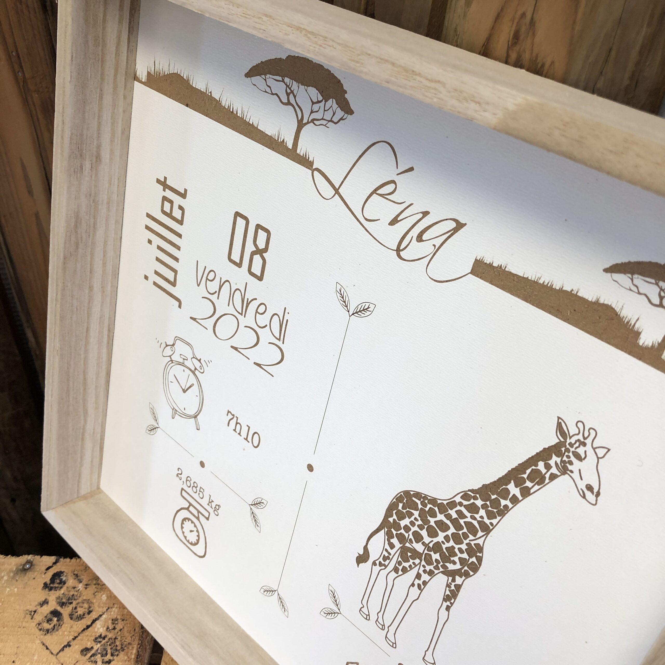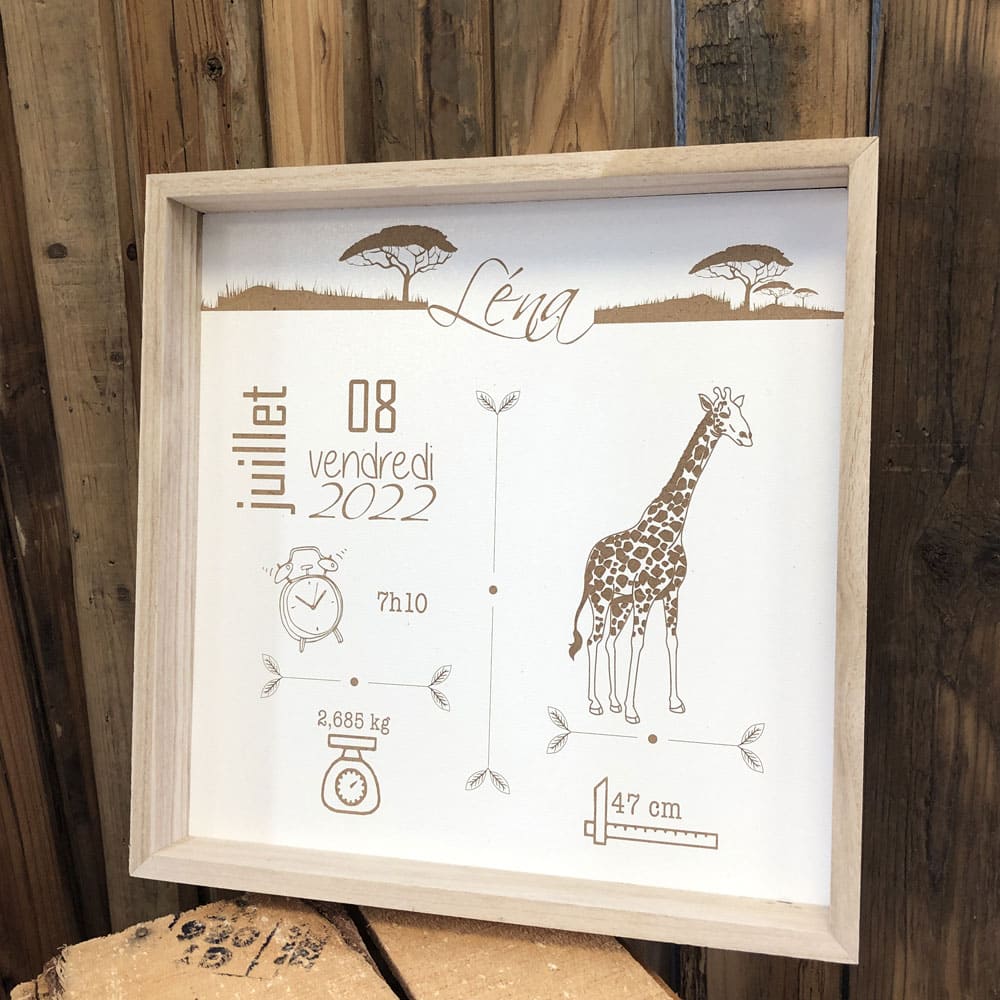 Ce cadre personnalisé « girafe » avec le prénom de bébé trouvera parfaitement sa place dans le doux cocon de votre tout-petit.