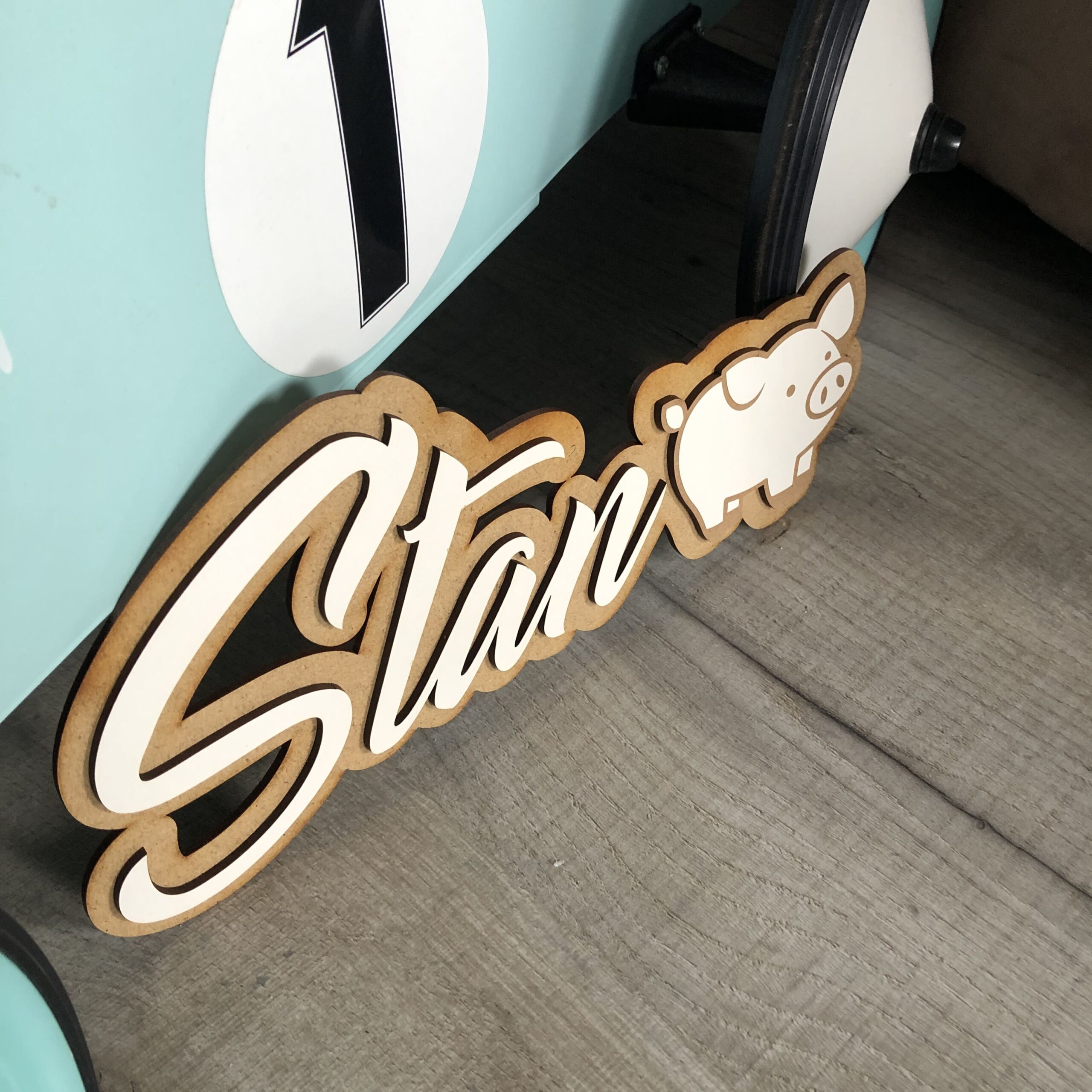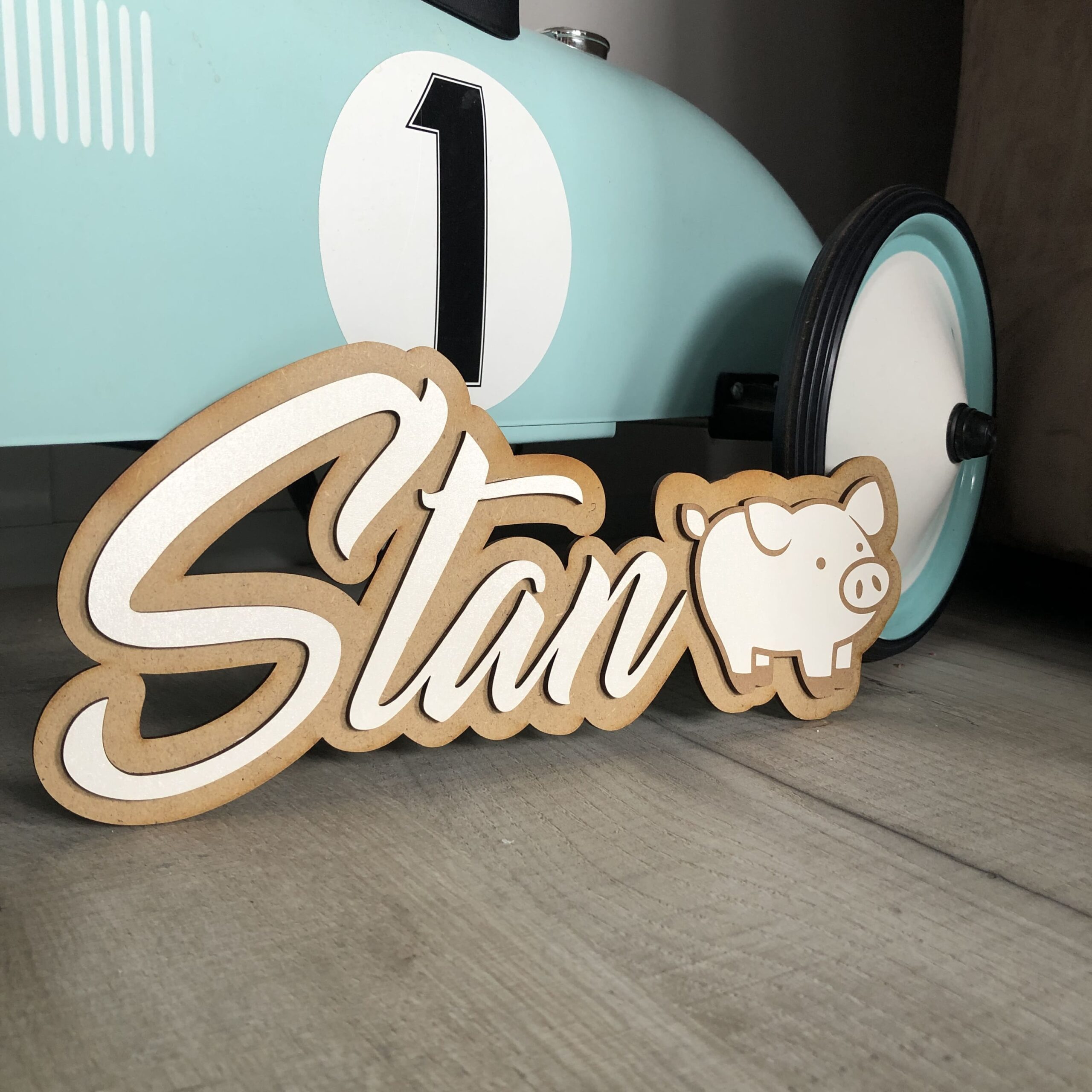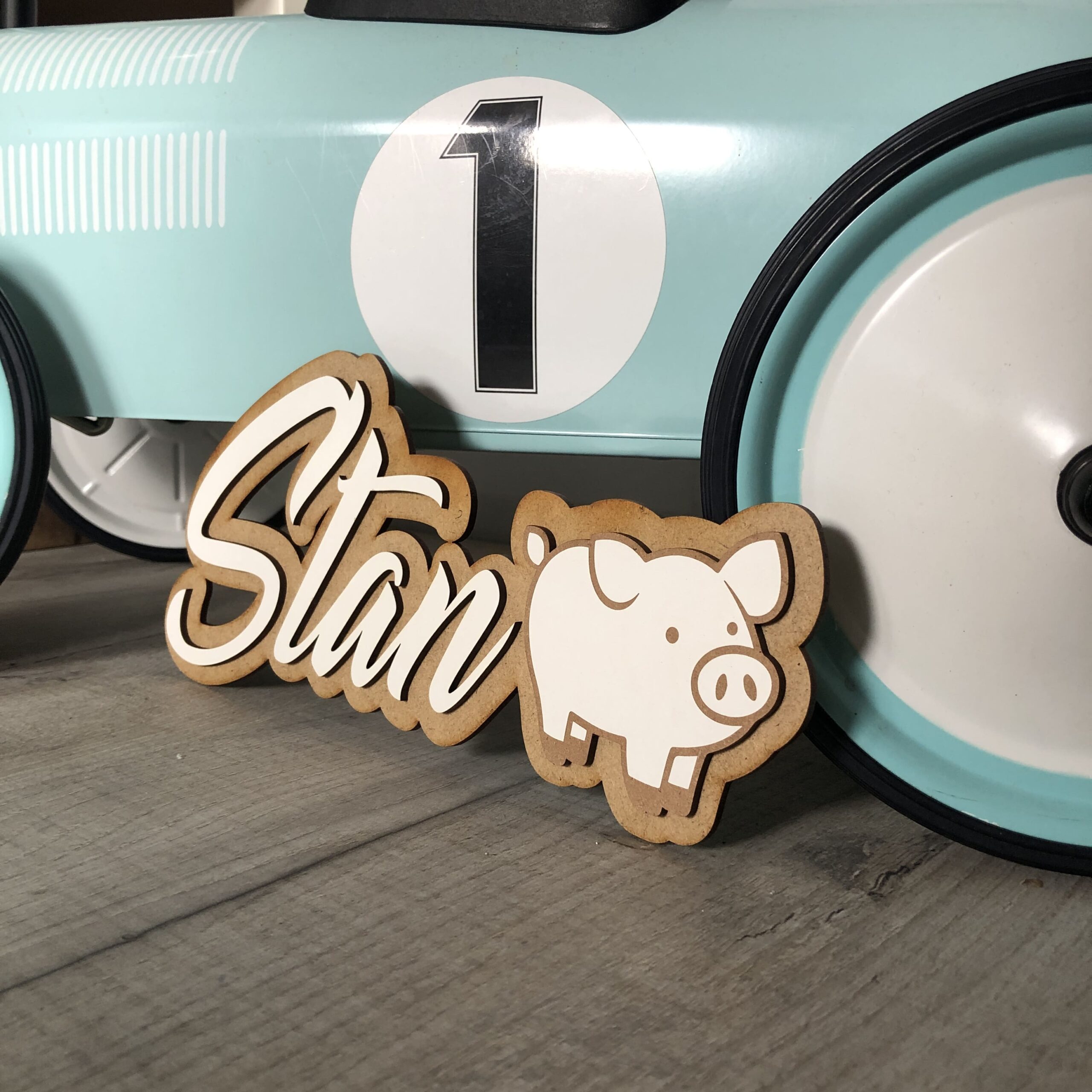 -bois (médium laqué blanc 3mm) pour le prénom et le cochon dessus